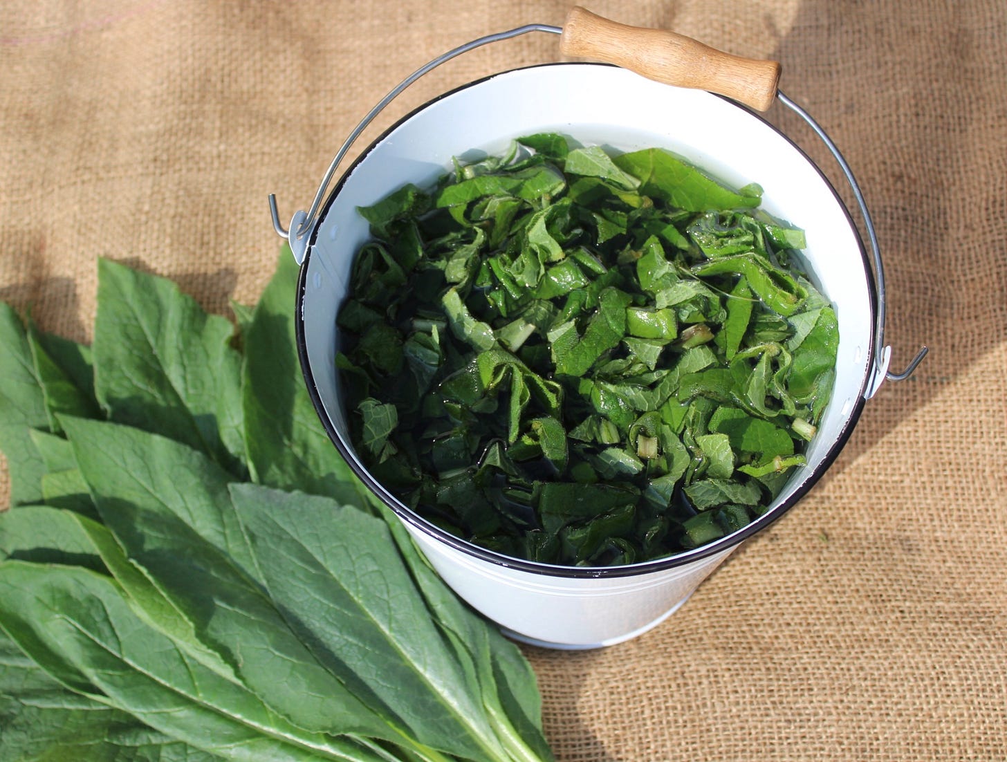 • Gather 2-3 lbs of fresh comfrey leaves (no flowers or stems for purity- use those for salves and other recipes)
